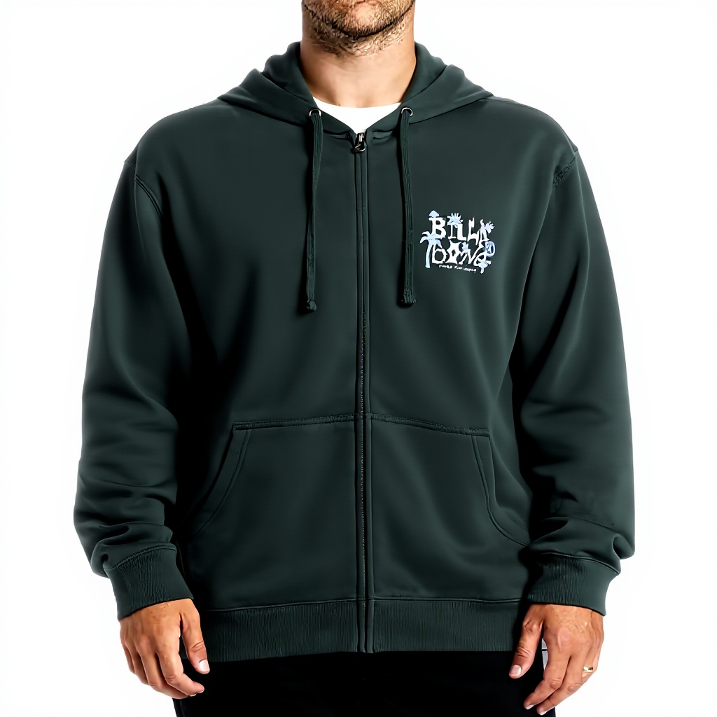 Le sweat est disponible en tailles S, M et L, avec une couleur vert forêt uniforme. Son design zippé facilite l’enfilage et le retrait, et le col à capuche offre une protection contre les intempéries légères. Le matériau est conçu pour résister aux lavages répétés tout en conservant sa forme et sa couleur, ce qui en fait un vêtement durable pour un usage régulier.